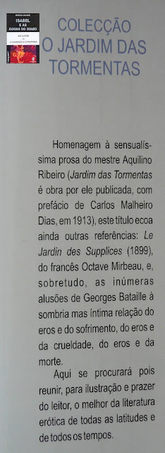 Das importantes e saudosas colecções trazidas a lume pela editora «Livros do Brasil", algumas agora redivivas mas sempre com diferente e inferior sabor, destaco aquela que aparece na fotografia: «O Jardim das Tormentas». Trata-se, como o confirma a badana, de uma clara homenagem a Aquilino Ribeiro, de uma homenagem à "sensualíssima prosa do mestre Aquilino Ribeiro". Abre a colecção o erótico «Isabel e as águas do diabo" de Mircea Eliade.